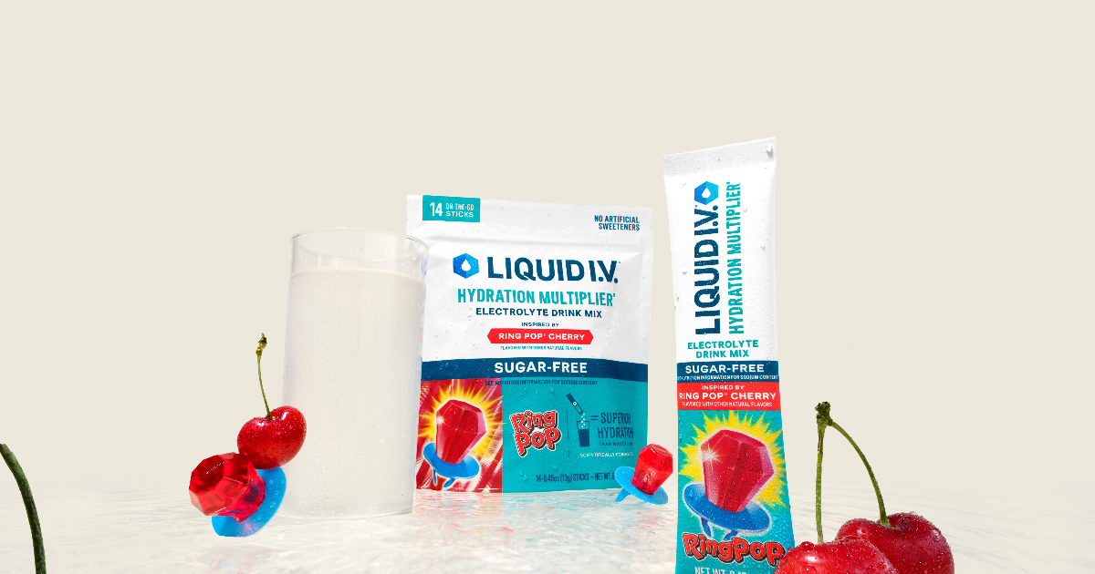 The rapid-hydration powder brand is tapping a nostalgic favorite for its latest LTO: Sugar Free Ring Pop Cherry. Find it in stores now for $24.99 per 14-count bag. More details available at liquid-iv.com.