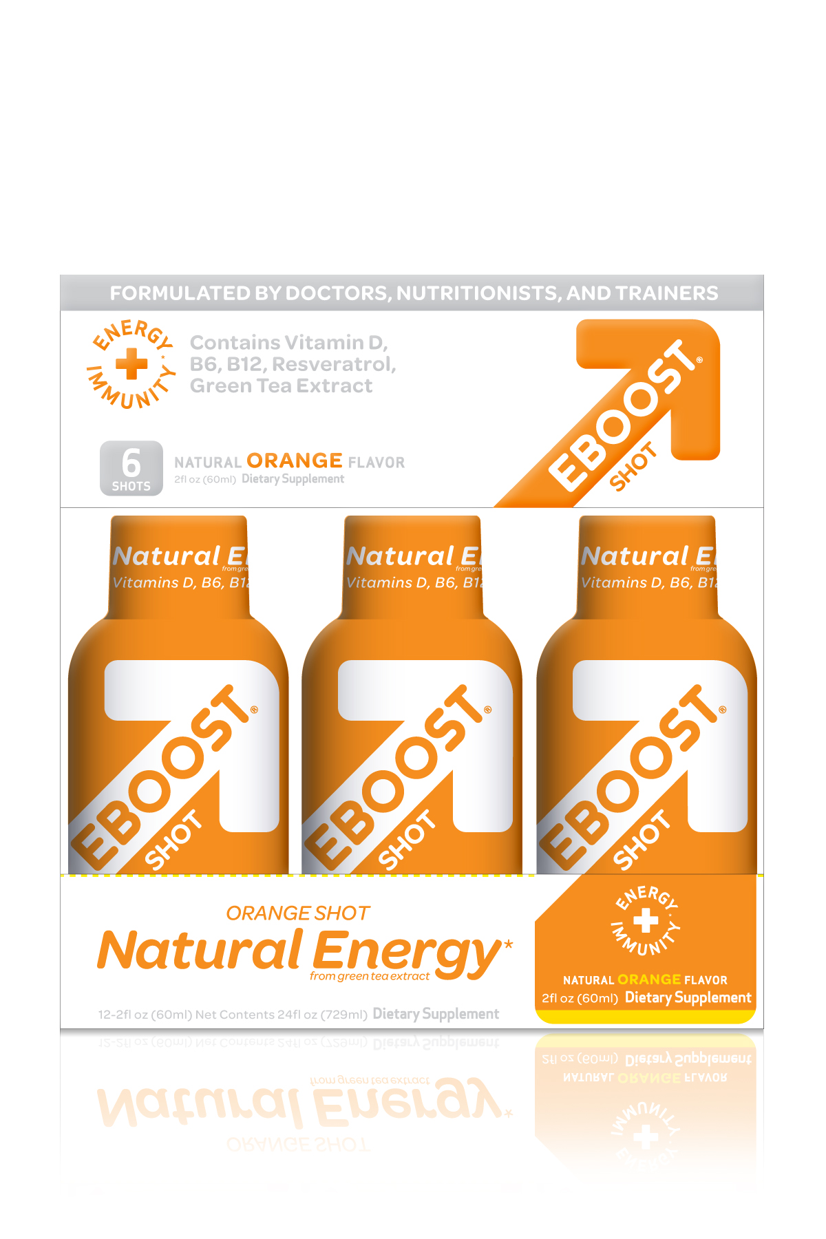 EBOOST is a premium, vitamin-infused drink that supports energy, immunity, recovery and focus. A responsible boost in an otherwise irresponsible category, EBOOST supports natural energy from green tea and the suggested daily allowance of essential vitamins and minerals. Offered in four delicious flavors including Super Berry, Orange, Pink Lemonade and Acai Pomegranate, EBOOST is available in effervescent powder packets and liquid shot form.