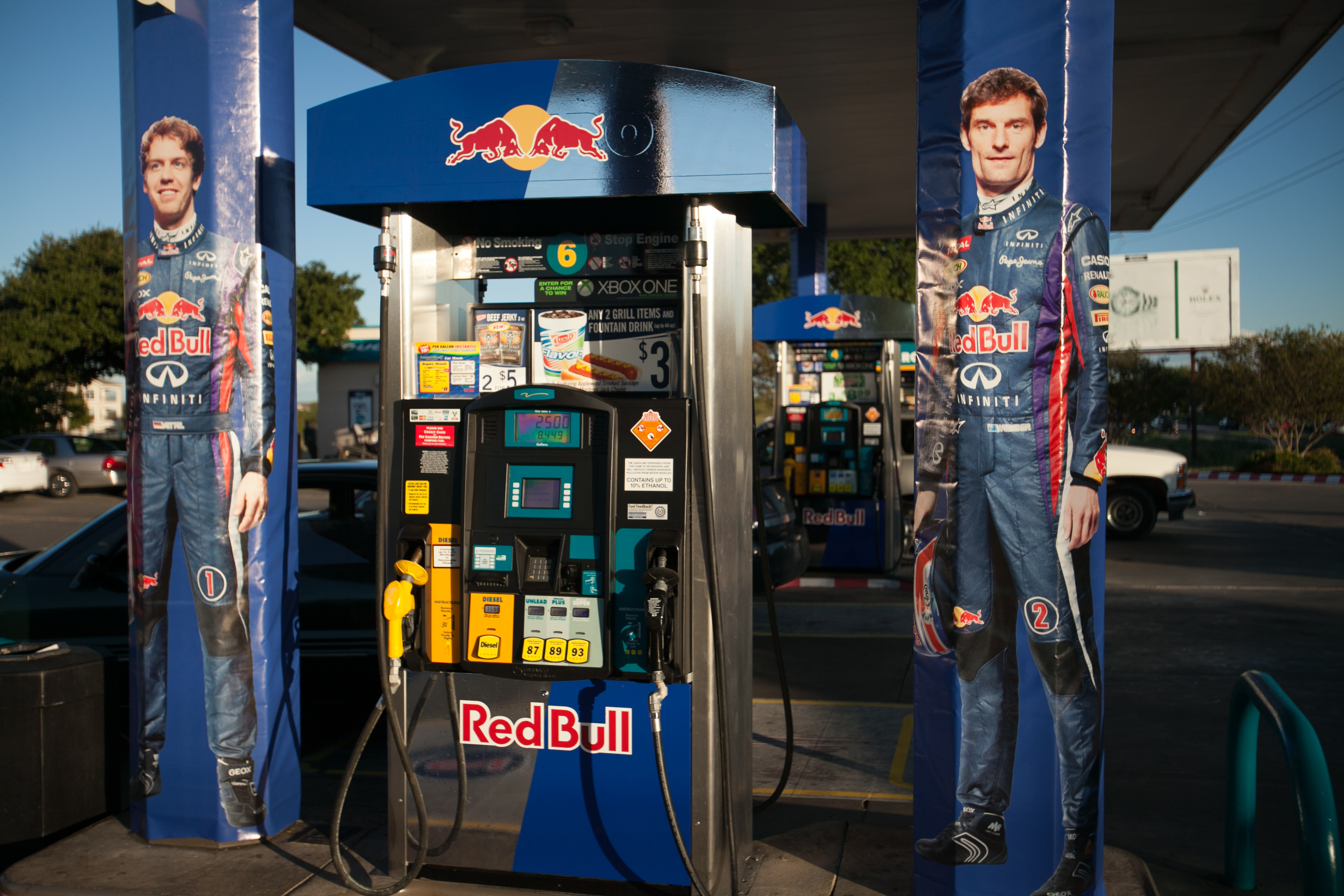 The Corner Store at 6306 Riverside Drive in Austin greets guests with red and white bumpers as they pull in, mimicking an F1 track, employees are wearing Infiniti Red Bull Racing hats, and each pump has been be turned into a miniature pit stop complete with life-size pictures of Infiniti Red Bull Racing drivers Sebastian Vettel and Mark Webber.