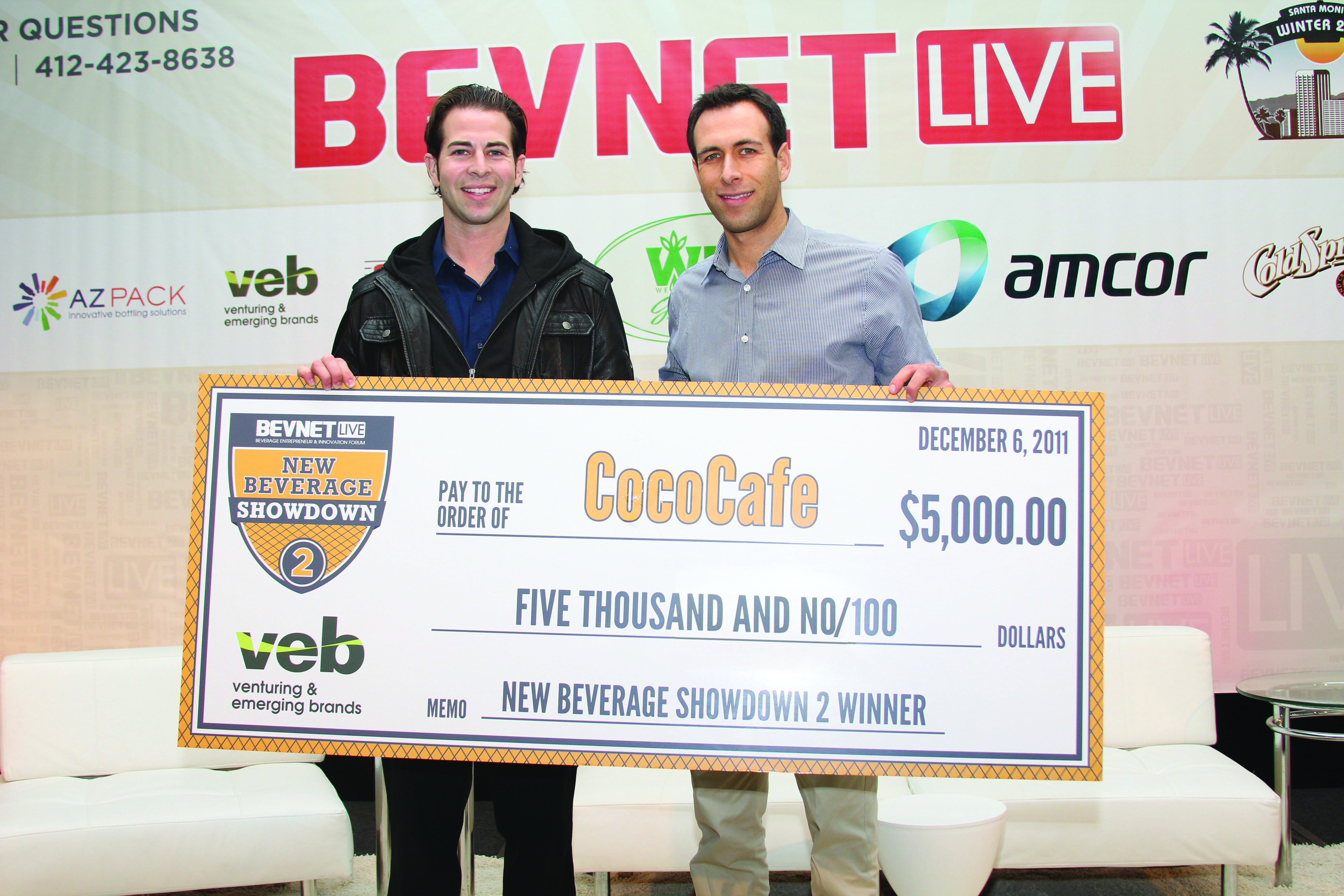 BevNET Live’s Tuesday afternoon session moved from inspirational brands to distribution and investment. The audience was introduced to a rising young distribution company, Gourmet Purveyors International, as well as several ideas about attracting brand investment, including a panel on brand incubation and another on recent trends in capital availability and the switch to capital efficiency as a measure of a brand’s investment-worthiness instead of growth rate. After a presentation on Field Marketing and another exploring diverse – and somewhat unorthodox — retail channels, it was time to announce the winner of the showdown: Coco Café. The company’s owners, Eilan Eifer and Brian McCaslin, work locally – so locally, in fact, that they were preparing to walk down Ocean Avenue, just outside the hotel, with their oversized winner’s check.