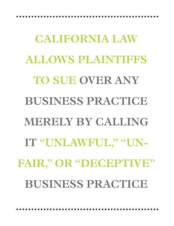 filed against industry participants big and small over various ingredients that allegedly make a beverage product not “all natural.” Ingredients that have been the subject of class action claims include of sodium benzoate, alkalized cocoa, disodium dihydrogen pyrophosphate, high fructose corn syrup (“HFCS”), synthetic vitamins, and genetically modified components, including soy. A variety of factors drive these types of cases, two of the biggest factors being the expansive nature of the consumer protection laws, particularly those in California, and the FDA’s failure to provide a clear definition of the term “natural.” Let’s start with a consideration of the consumer protection laws in California. California law allows plaintiffs to sue over any business practice merely by calling it “unlawful,” “unfair,” or “deceptive” business practice. The bar is set pretty low and makes it relatively easy for someone to sue. Plaintiffs’ trial lawyers can, and do, claim that almost anything is an unfair or deceptive practice, including labeling a product “all natural” when it contains some component that is arguably not “natural.”