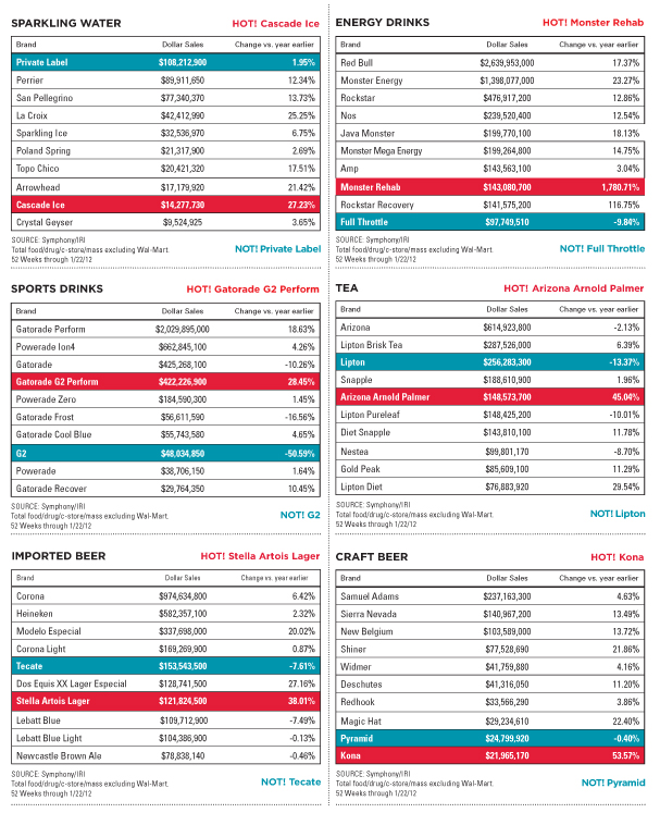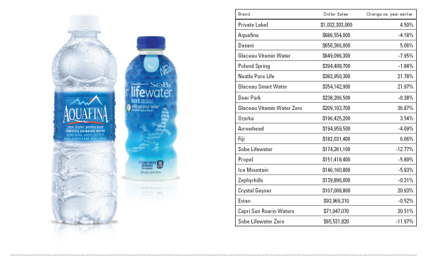 As the story on page 40 indicates, bottled water overall has regained its lost mojo and has slowly begun to start making sales gains again. To really see where the movement is, however, look at the high end and low end of the spectrum: private label is up higher than the category average, as are premium brands Smartwater, Fiji, Voss, and Icelandic Glacial. Even Evian, which has struggled mightily to make up lost ground, has dropped its losses to near-even – could be a big year for the ol’ gal.