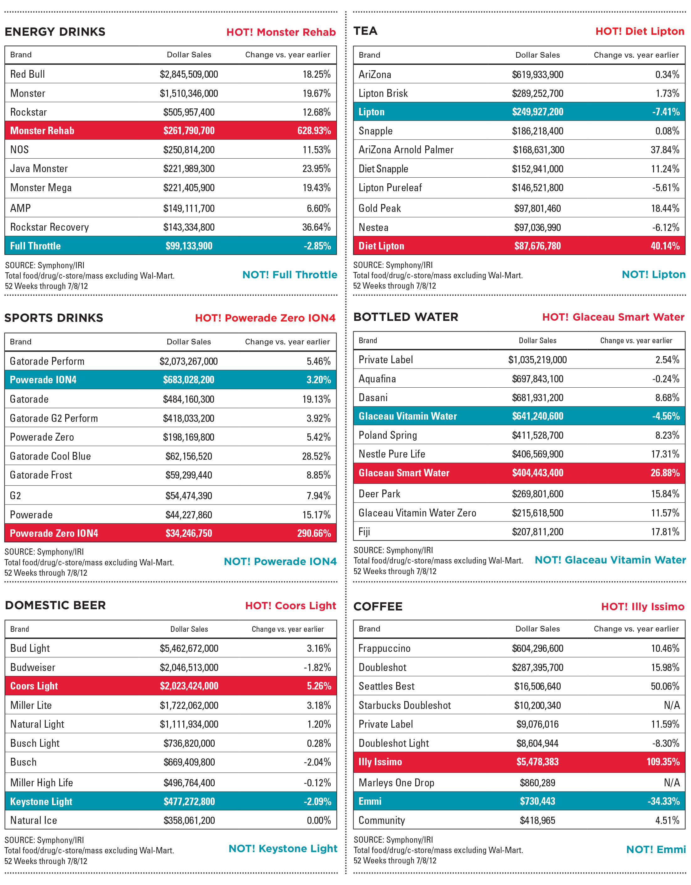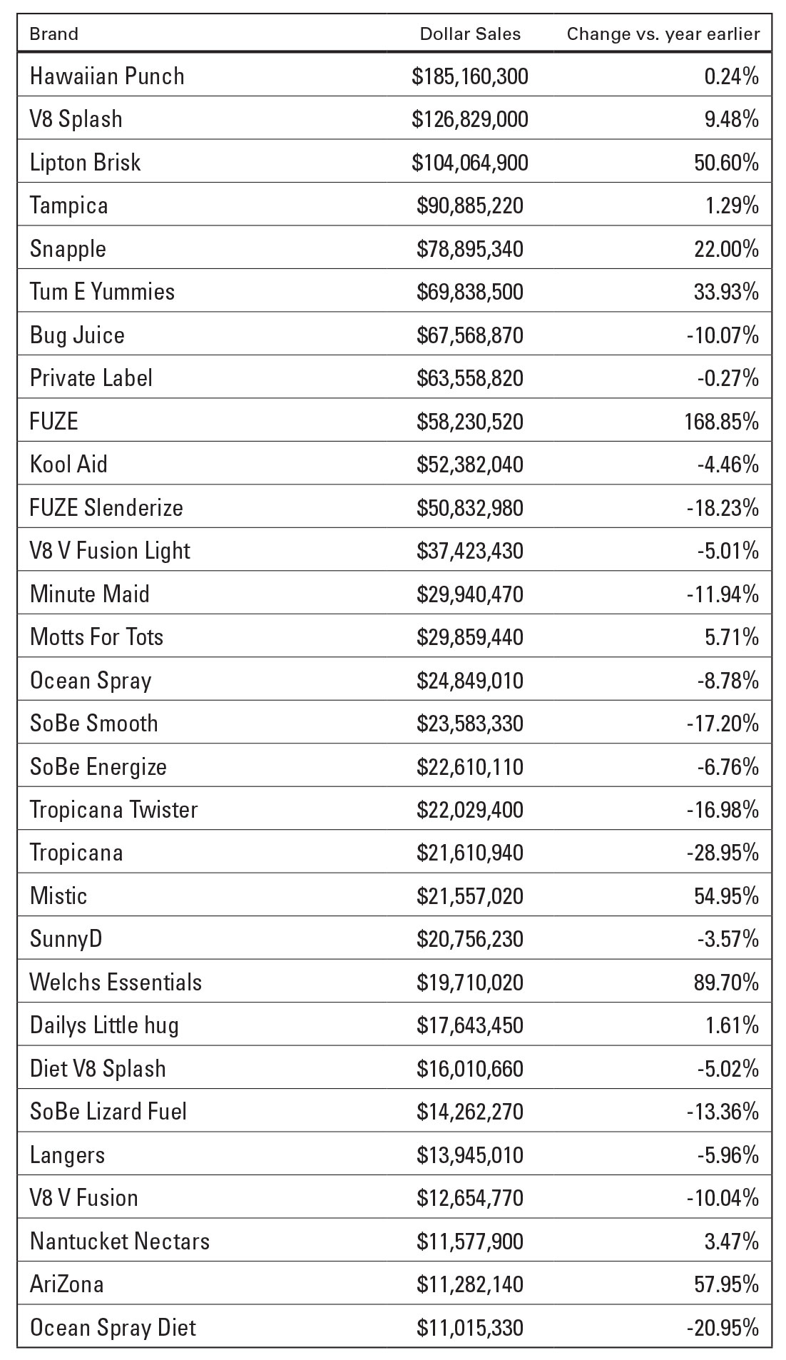 It’s amazing what distribution can do – look at FUZE, which is coming on strong in single-serve, and at Lipton, which is also showing major growth in what is a very minor part of its line (Brisk). Meanwhile, wouldn’t you love to get a peek at Tum E Yummies’ Wal-Mart numbers, since they just passed Bug Juice in the big four-channel listing? That’s strong growth for a company that continues to move up in the pack. Hawaiian Punch is steady. Honest Ade isn’t showing us much here, but there’s another $3 million hidden in Sports Drinks for some reason. Strange grouping.