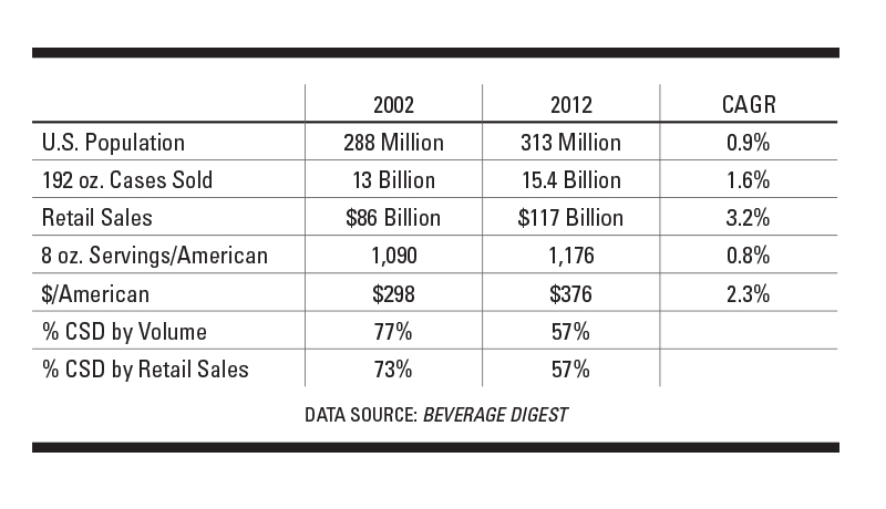 The beverage marketplace has grown 1-2 percent annually. But CSD’s have been losing share at a rate of between 1 percent and 2 percent annually, as well. This trend was slowed at the height of Bush Recession, but has resumed in the years since. As a result, the CSD share of the Beverage market in 2012 was 57 percent: 20 share points lost since 2002.