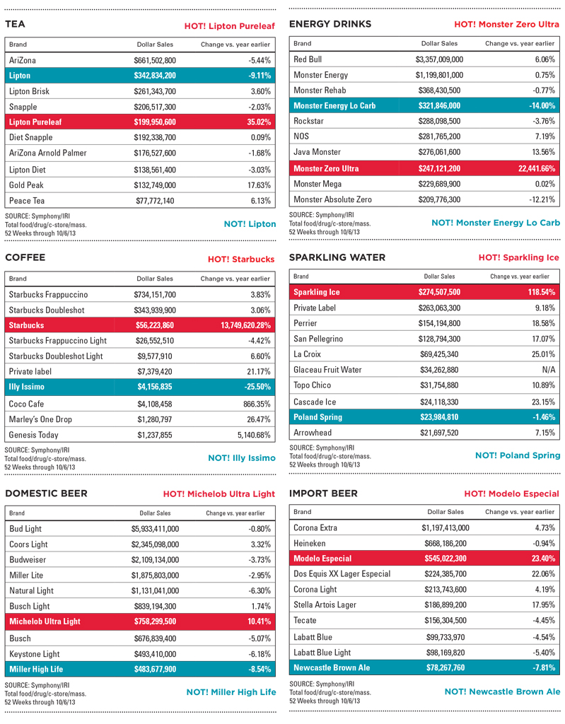 It’s easy to disrespect the Coke purchase of Glaceau, but taken together, the company brands have sold $1.3 billion in IRI-tracked channels in the past year; that puts the whole Coke water system at $2.2 billion, well ahead of PepsiCo. Smartwater has nearly eclipsed Vitaminwater, it’s true – but that gives the red system a premium-priced alternative to Dasani and a brand architecture that many brands would only dream of (NWNA was certainly dreaming of it when it launched Resource Water last year, for example.) Still, next year’s Vitaminwater relaunch will be a big moment for Coke, as the tailspin for that brand has continued throughout the fall. With Sparkling Ice moving more strongly into convenience, the Glaceau unit had better be ready for a fight in 2014.