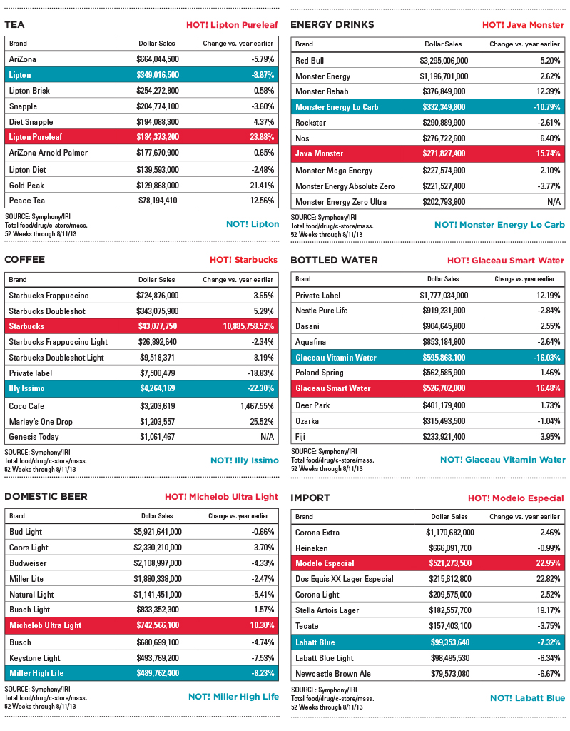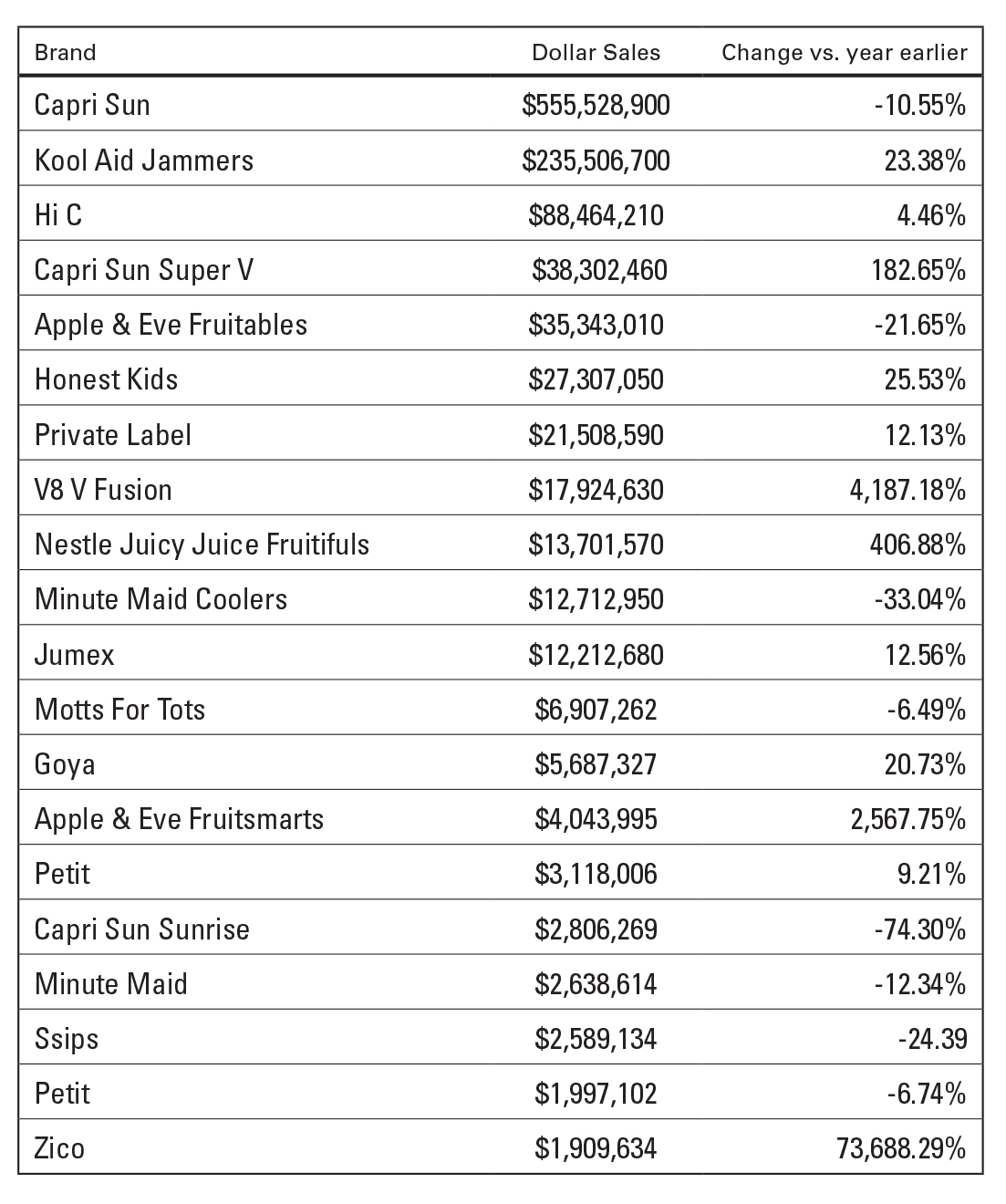 While our sources don’t necessarily sort by marketed demographic, here’s an interesting look at some of the top kids’ beverages via a look at the $1.1 billion aseptic juice drinks category. No surprise that Capri Sun is the leader here, but there are rising brands in the mix, including Honest Kids and V8 V-Fusion. For more popular juices aimed at the younger set, check our Kids Beverages’ story on page 34.