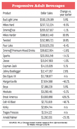 But first: It can be a bit of a touchy subject trying to group all of these products together. Progressive adult beverages (canned cocktails from Anheuser-Busch InBev, Four Loko, Boston Beer’s Twisted Tea) are tracked differently than, say, ciders by retail information compilers like IRI. The firm is considering moving Redd’s Apple Ale from MillerCoors to the PAB category, for instance, whereas now, it’s considered a super premium beer.