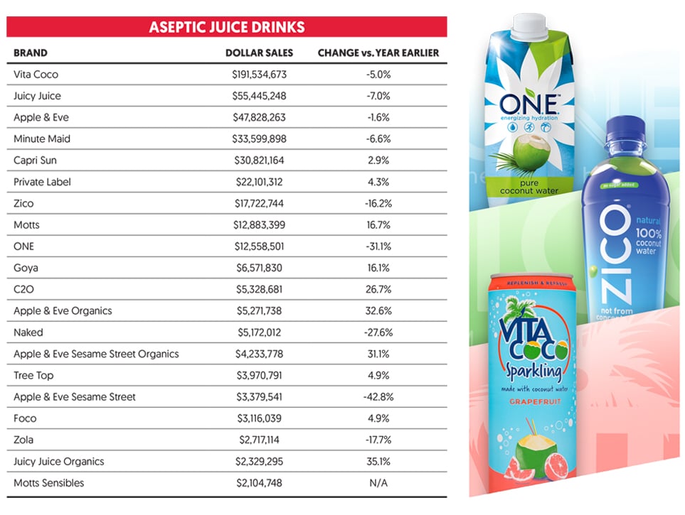 Is coconut water starting to slip? A look at Aseptic Juices, the largest beverage category in which the core brands are represented, would seem to indicate some softening in the drupe extract business. Each of the original “big three” – Vita Coco, Zico, and ONE – has lost sales volume and only a couple of smaller brands are showing any kind of progress. In refrigerated, it’s a different story, with Harmless Harvest, Vita Coco and Zico cold-channel offerings up a bit but that’s in a much smaller category group. Expect some retrenching and innovation as the summer takes hold.