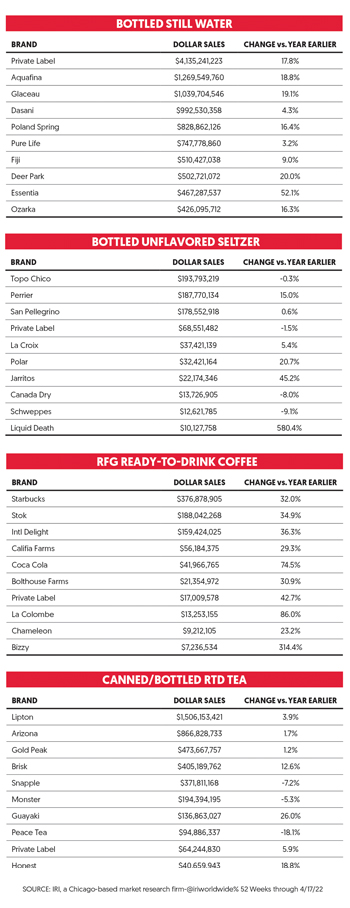 Summer is — believe it or not — around the corner so we hope you’ve done some stocking up on lemonade. In the refrigerated section, it looks like Simply is all you need. But if you’re looking ambient, check out the moves that Calypso is making now that it’s in New York — way, way up with a lot of momentum. Also starting to chart in mainstream channels: natural channel upstart Me & the Bees. Great to see this tiny, purpose-driven brand grow up!