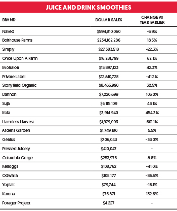 Can the new ownership of Bolthouse and Evolution Fresh juices revive the doldrums-mired Smoothie category? After three years of ownership by PE firm Butterfly Equity, it looks like Bolthouse is on an upward trajectory, while foundational brand Naked continues to plod from a leadership position. Meanwhile, lots of entrepreneurial brands are starting to chart here, from Koia to Suja to a reformulated Harmless Harvest. Also making noise: squeeze-pack brand Once Upon A Farm.