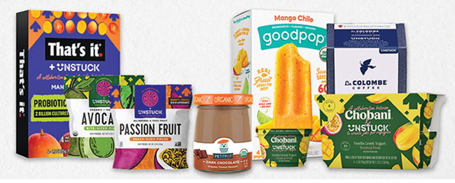 With six brands now on board, UNSTUCK is now supported by seven new products: Chobani Vanilla Greek Yogurt with Tropical Fruit, That’s it. Mango Probiotic Fruit Bar, La Colombe Monaco Medium Roast Coffee, GoodPop Mango Chile popsicle, Petit Pot Dark Chocolate Organic French Dessert, Pitaya Foods Natural Passion Fruit Pieces and Organic Avocado Pieces.