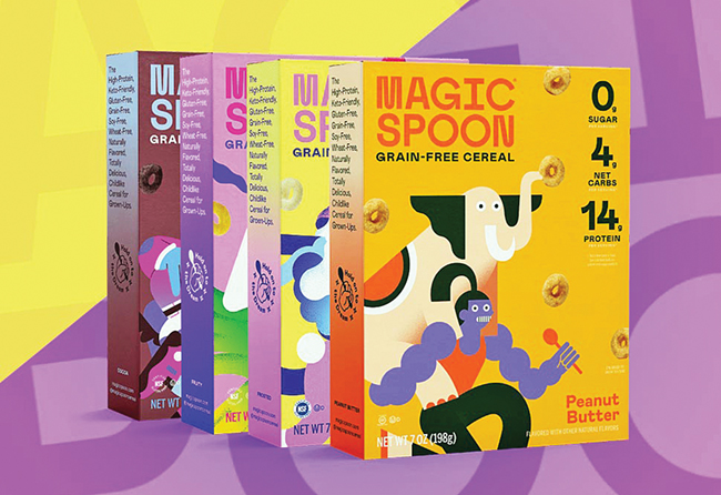 Magic Spoon cereals contain up to 14 grams of protein and 4 grams of carbs per serving, depending on the SKU. The product also taps timely consumer demands with its callouts for low sugar, and no added sugar, gluten, soy and artificial ingredients. The full lineup includes flavors like Cinnamon Roll, Frosted, Blueberry Muffin, Maple Waffle and Cookies & Cream.