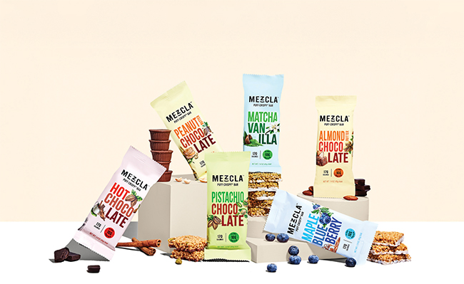 Mezcla markets a line of plant-based snack bars featuring a distinctive puff-crispy texture. The products are available in more than 9,000 retail outlets nationwide including Whole Foods, Sprouts, Publix, H-E-B and select Target, Albertsons, Kroger and Costco regions. Flavors include Pistachio Chocolate, Matcha Vanilla, Maple Blueberry, Hazelnut Chocolate and Frosted Strawberry.