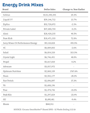 Energy drink brands have also started to reap big benefits from portable, powdered versions; mixes in that category were up 18% last year, according to Circana, with Celsius, Alani Nu and C4 leading the way among established beverage companies. Meanwhile, Liquid IV has launched its own caffeine-fortified mix and the brand is moving up in the powdered energy pack.