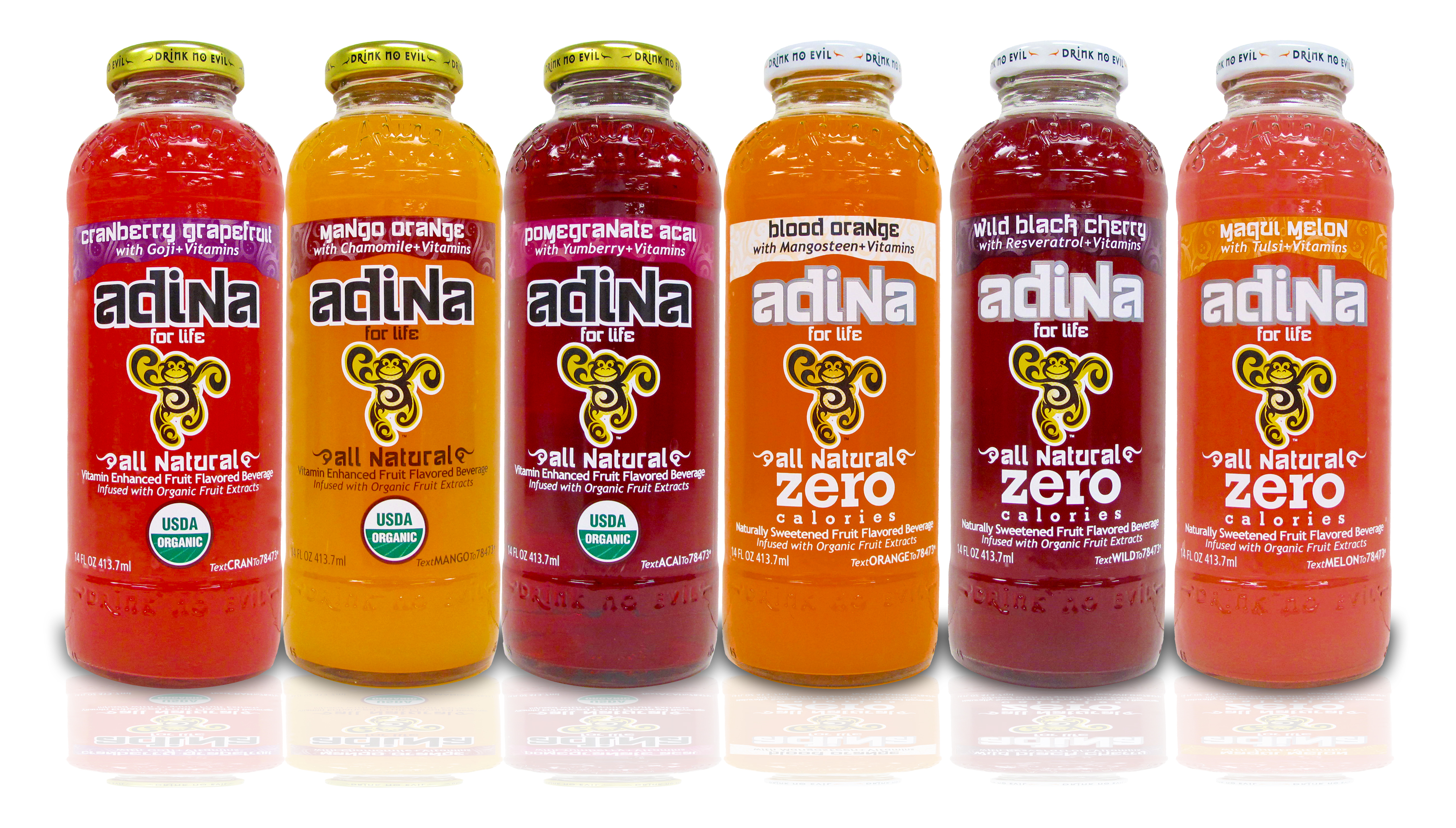 All of Adina’s products are perfectly balanced with refreshing fruit notes, enriched with vitamins, and contain a key functional ingredient. Goji used in the Cranberry Grapefruit flavor has been used for more than 3,000 years to promote good health. Chamomile used in Adina’s Mango Orange has long been used as a holistic remedy to fight colds and calm nerves, while Yumberry used in the Pomegranate Acai is known to reduce blood pressure and lower bad (LDL) cholesterol. Resveratrol found in Wild Black Cherry aids in slowing down cellular damage, giving cells added energy for self-repairs. Tulsi, which is used in the new Maqui Melon product is a nerve tonic used to sharpen focus and memory, and Mangosteen used in the new Blood Orange flavor has been identified as a powerful source of anti-oxidants and used to promote health.