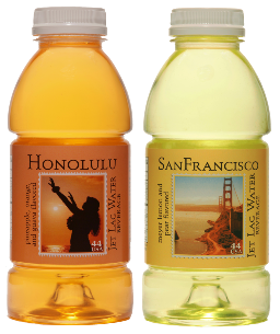 The initial four brands are “Honolulu” Jet Lag Water™, “San Francisco” Jet Lag Water™, “Beijing” Jet Lag Iced Tea™, and “Tokyo” Jet Lag Iced Tea™. Each beverage is packaged in a 16.9oz PET bottle.Each Jet Lag Beverage™ contains a proprietary blend of 5 vitamins, 6 minerals, and 3 herbs that biologically correlate with relief /prevention of specific jet lag symptoms. For example, water helps you stay hydrated; Vitamins B3 and B5 are known to relieve anxiety/stress; Vitamin B6 prevents fatigue and headaches; zinc and selenium are trace minerals that help strengthen the immune system; calcium and magnesium prevent insomnia and promote restful sleep. Jet Lag Beverages™ have no calories, no caffeine, and all ingredients are Generally Recognized as Safe (GRAS) by the U.S. Food and Drug Administration (FDA). They do not contain melatonin.