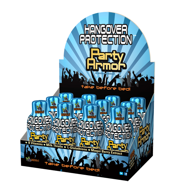 Party Armor™ is a 2oz. shot that you take before bed (after a night of drinking) to protect against dreaded headaches, nausea, and fatigue associated with alcohol consumption. Should you forget to take Party Armor™ at the end of your night, you can also take it – the morning after – to alleviate your hangover symptoms.