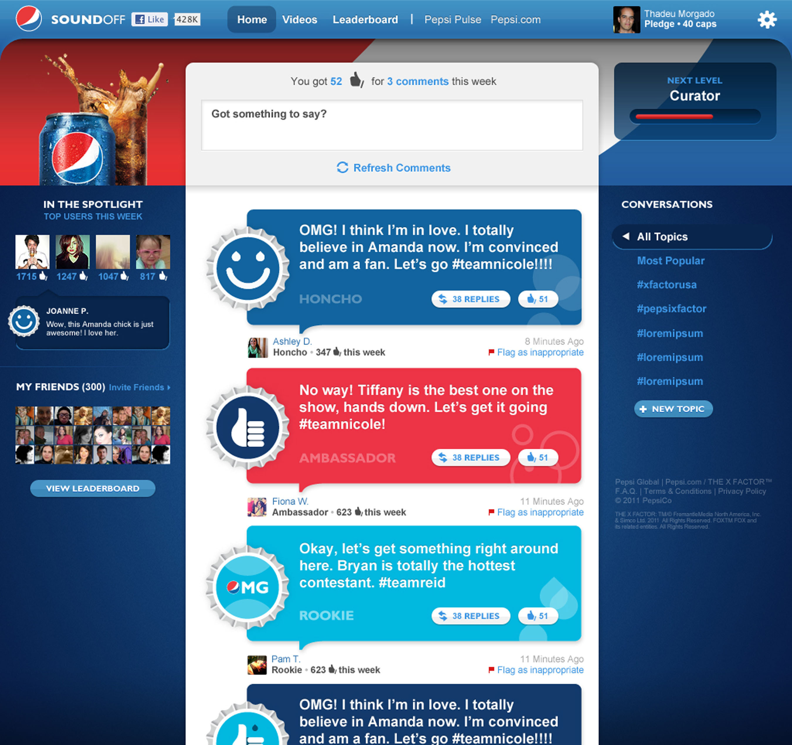 Users log-on to Sound Off using their existing Facebook or Twitter accounts and have the option to communicate solely on Sound Off or share their thoughts on other social media platforms. As users contribute their comments about the show, they can have their comments “fanned” by other users. Having the most “fans” will earn four users a place in the “Spotlight” and the reward of having their comment and profile featured on-air in a Pepsi advertisement during the broadcast. The more someone interacts with the site, the higher their rank will be eventually earning “ambassador” status within the platform.