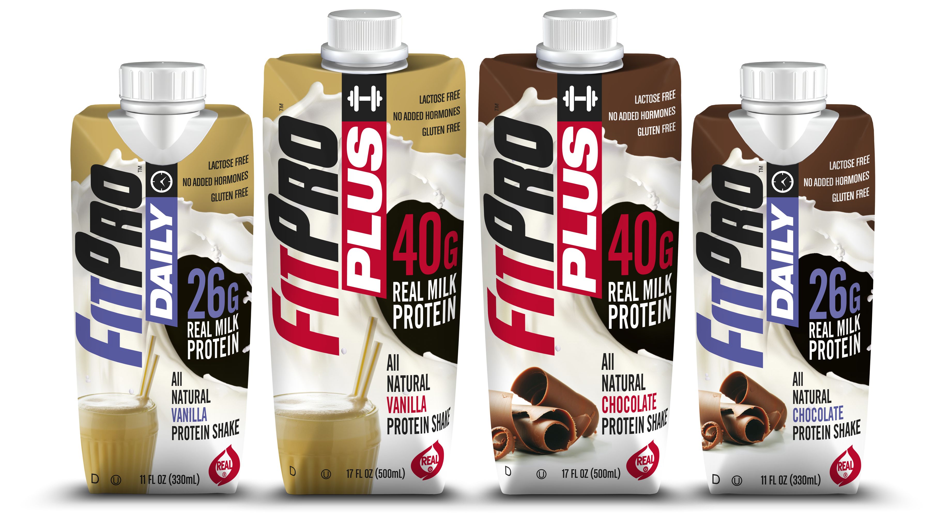 FitPro launches with two distinct product lines. The 17 oz. “Plus” line, designed for athletes and workout enthusiasts, contains 40 grams of protein and just 250 calories. The 11 oz. “Daily” line, made for active individuals, contains 26 grams of protein and 160 calories. Both product lines are available in chocolate and vanilla flavors. Packaged in Tetra Pak cartons, the product is shelf-stable for up to 16 months. FitPro’s all-natural formulation has been well-received by retail buyers. Unlike many conventional protein shakes, which utilize rehydrated whey and casein powders as their protein source, FitPro uses ultrafiltered milk.
