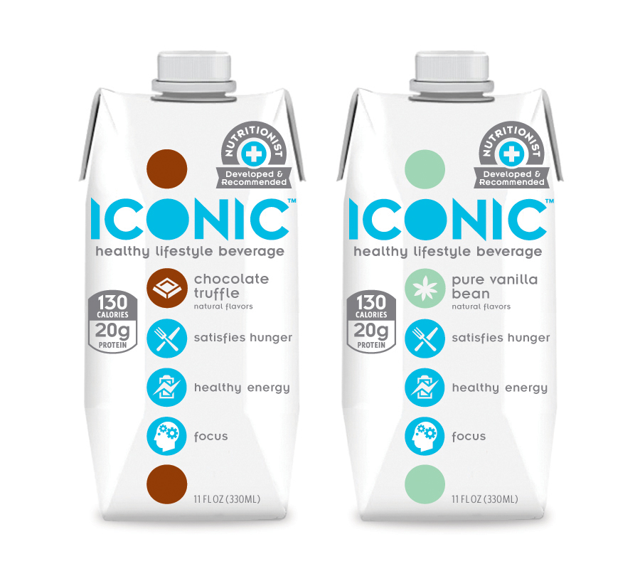 The 11oz. ICONIC packs only 130 calories and 3g of sugar while delivering 20g of protein. ICONIC blends natural ingredients that promote energy and focus while eliminating hunger. Designed for on-the-go consumer in need of a filling and low calorie beverage, ICONIC is packaged in a recyclable Tetra-Pak container.