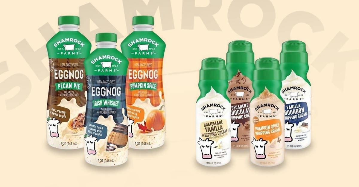 Dairy company Shamrock Farms is embracing fall and holiday flavors with the debut of Pumpkin Spice, Vanilla Bourbon, Homemade Vanilla and Decadent Chocolate flavored whipping creams and the launch of its Pumpkin Spice, Irish Whiskey and Pecan Pie flavored eggnog. Both holiday-inspired product lines are available in 32 oz. resealable bottles in select regions at retailers such as Albertsons, Giant Food, Target and Walmart.