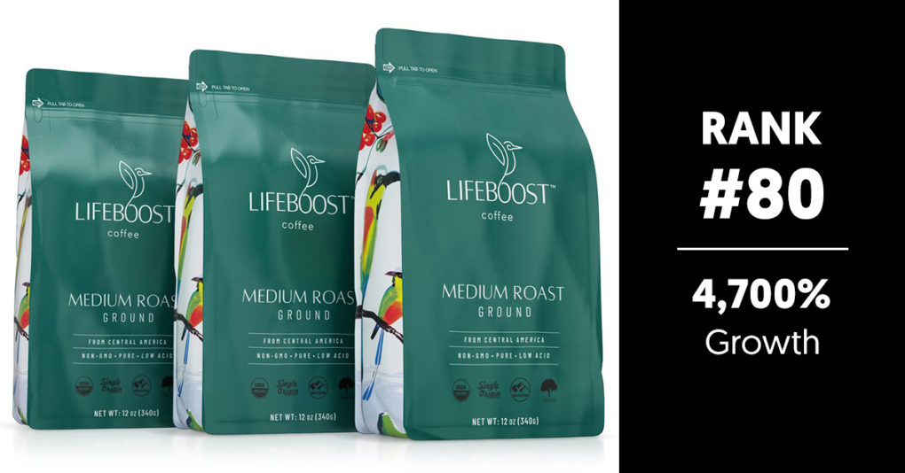 D2C-focused company Lifeboost Coffee ranked at number 80 on the list with its low-acid organic coffee beans. The Indiana-based company grew 4,700% during 2020 and recently launched a powdered anti-aging coffee creamer to complement its coffee subscription box service.