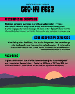 “We are looking to convey the importance of hydration with our ‘Get Hy’ campaign, a play off of the big consumption day that leads to major dehydration,” said Al Goldman, Creative Brand Manager of Ee. “Essential Elements works tirelessly to ensure we provide the finest ingredients without any extra additives that work to replenish electrolytes, leaving consumers feeling hydrated and giving them that extra boost to take on any event during festival season.”