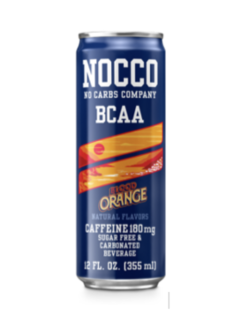 NOCCO Blood Orange contains 180mg of caffeine, 3000mg BCAAs, and 4 different vitamins. It’s carbonated, sugar-free, and a low calorie product like other NOCCO flavors.