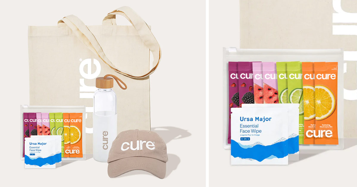 Hydrating electrolyte mix brand Cure has added a new format to its portfolio of products: bundles. The Travel Essentials bundle ($50) features hydrating electrolyte mixes in four flavors, Cure branded earphones, antibacterial wipes, an eye mask, a pack of gum and lightweight moisturizer. The Fitness Essentials bundle ($75) contains electrolyte mixes in four flavors, two face wipes and a Cure branded water bottle, tote bag and baseball cap. The Party Essentials bundle ($40) features electrolyte mixes in four flavors, gum, hair ties and Cure branded band-aids. All three bundles are now available online. For more information, visit curehydration.com.
