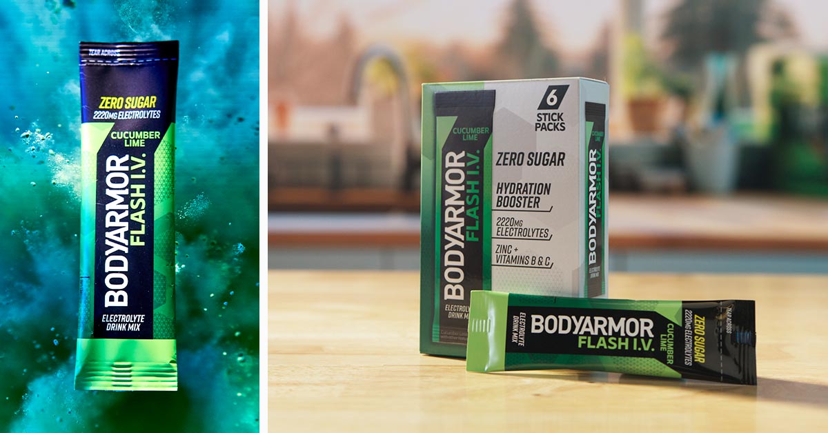 BodyArmor has entered the powdered hydration space with a new stick line, BodyArmor Flash I.V. Hydration Boosters, available in Tropical Punch, Cucumber Lime, Grape, Strawberry Kiwi and Lemon Lime flavors. Rolling out to retail stores now, the powders will be sold in 6-packs and 15-packs. For more information, visit drinkbodyarmor.com.