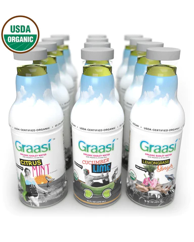 Grassi is a plant based, USDA Certified Organic barley water. It is shelf stable and there are only 35 calories to a bottle. Graasi is a hydration and immunity beverage. It delivers 100% of the RDA of vitamins C, D, and Zinc.