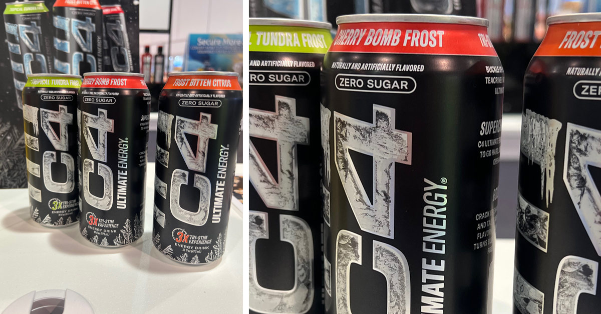C4’s other big NACS reveal was Frost, a collection within its max-strength (300mg caffeine) Ultimate line in three flavors: Frost Bitten Citrus, Tropical Tundra Frost and Cherry Bomb Frost. The thermo-activated black can – the silver font turns blue when cold, a la Coors Light – is a big part of the appeal; 75% of consumers will purchase based on package design, Lawless noted. Consumers stumping for that level of energy (“carefree caffeiners,” as dubbed here) aren’t a huge market, but C4’s approach has been to cater intentionally to different subsets with its various lines.