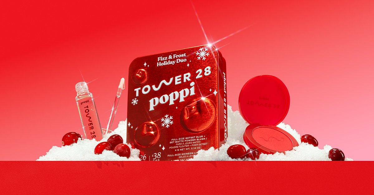 Gearing up for the holiday season, prebiotic soda brand Poppi is teaming up with beauty brand Tower 28 to launch the limited edition Fizz & Frost Holiday Duo.