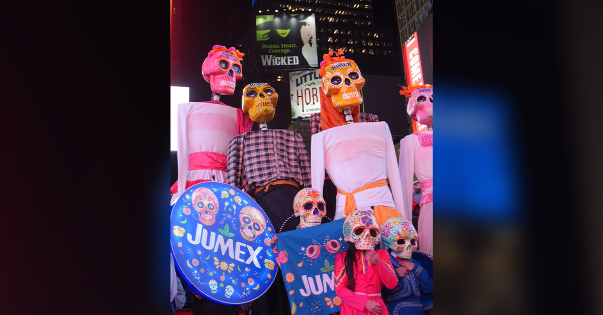 The celebration in Times Square on Oct. 20 featured an evening parade of Catrinas – the skeletal figures symbolic of Día de los Muertos – and a sampling of Jumex’s Día de Muertos Special Edition Latabotella drink. Offered in four flavors Mango, Peach, Guava and Strawberry Banana – the limited edition cans are available at Walmart and convenience stores nationwide.