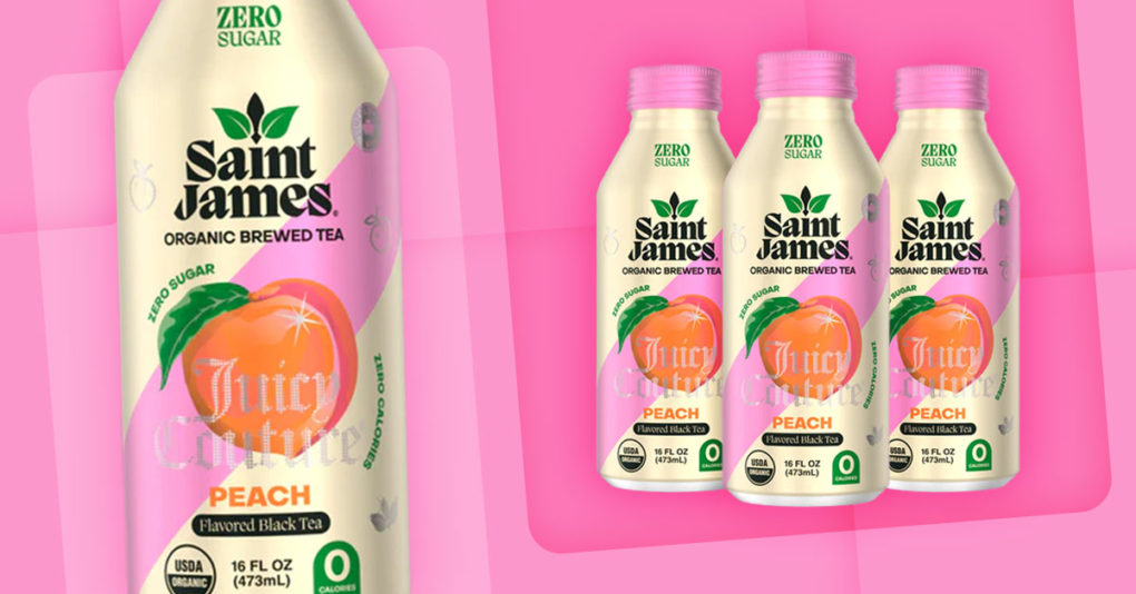Iced tea maker Saint James has teamed with iconic fashion brand Juicy Couture for a new limited time Juicy Peach flavor. Drawing on 2000s nostalgia for rhinestone tracksuits, the drinks come in 16 oz. aluminum bottles and are launching in Target stores nationwide and online via Amazon. For more information visit saintjamesicedtea.com/.