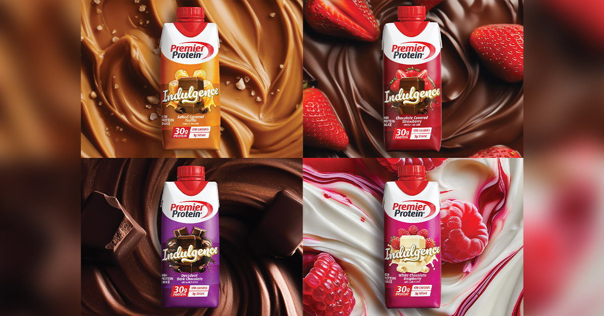 Seeking to help consumers stay on track with their health and wellness goals, Premier Protein has released its Indulgence protein shake line. Available in four dessert-inspired flavors – Decadent Dark Chocolate, Salted Caramel Truffle, Chocolate Covered Strawberry and White Chocolate Raspberry – the shakes have 30 grams of protein, 3 grams of sugar, and 170 calories. Premier Protein Indulgence Shakes are now available at Walmart, Walmart.com and Amazon. For more information, visit bellring.com.