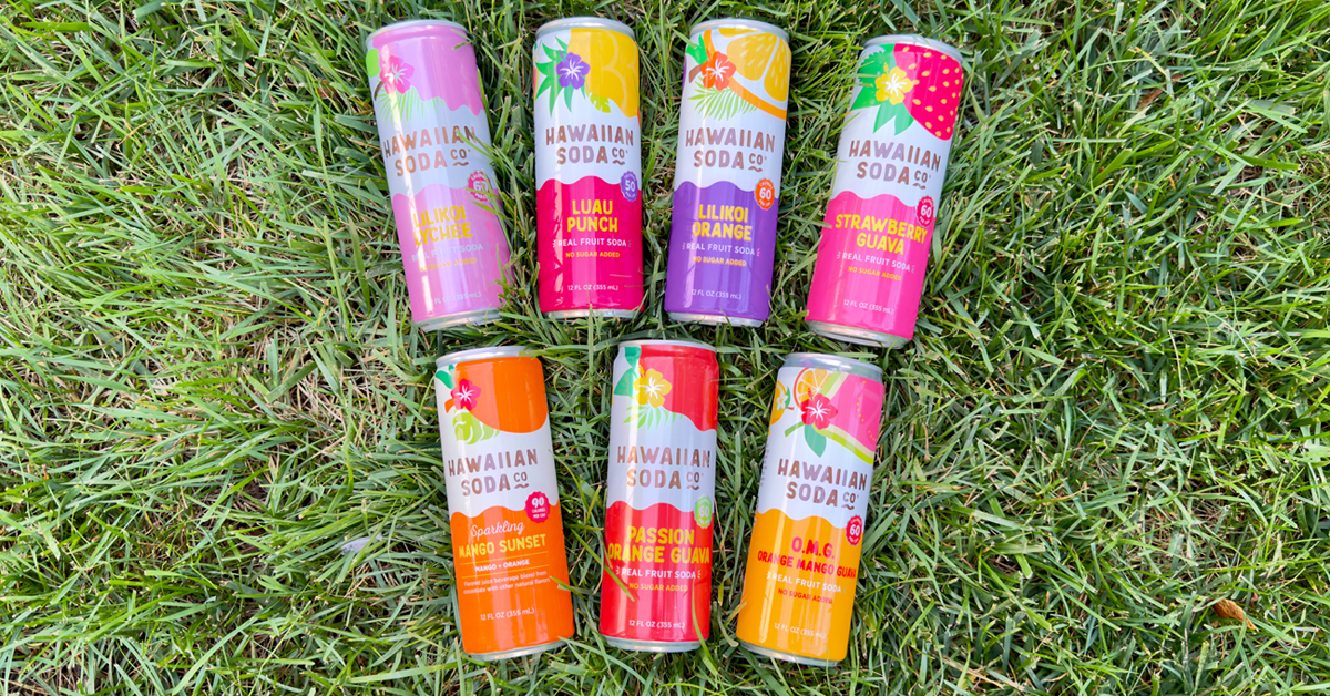 Hawaiian Soda Co. is a line of 12-ounce cans that highlight tropical-inspired flavors such as Mango Sunset, Strawberry Guava, and Lilikoi Orange. Made with 33% to 50% real juice and sweetened with stevia, these sodas contain between 50 and 90 calories and have zero grams of added sugar. The lineup leans more toward sparkling juice than traditional soda, but the positioning emphasizes clean ingredients and a Hawaiian-inspired flavor story.