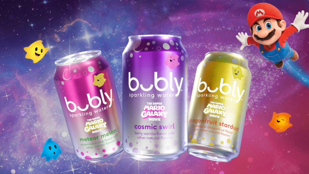 PepsiCo’s Bubly is getting ready for the Super Mario Galaxy Movie with a line of limited edition tie-in sparkling waters featuring “Galactic-Inspired” flavors Meteor Melon (watermelon lime), Cosmic Swirl (vanilla and berry) and Dragonfruit Stardust. The cans feature fan-favorite Super Mario characters and the launch is being promoted with consumer sweepstakes campaigns. For more information visit bubly.com.