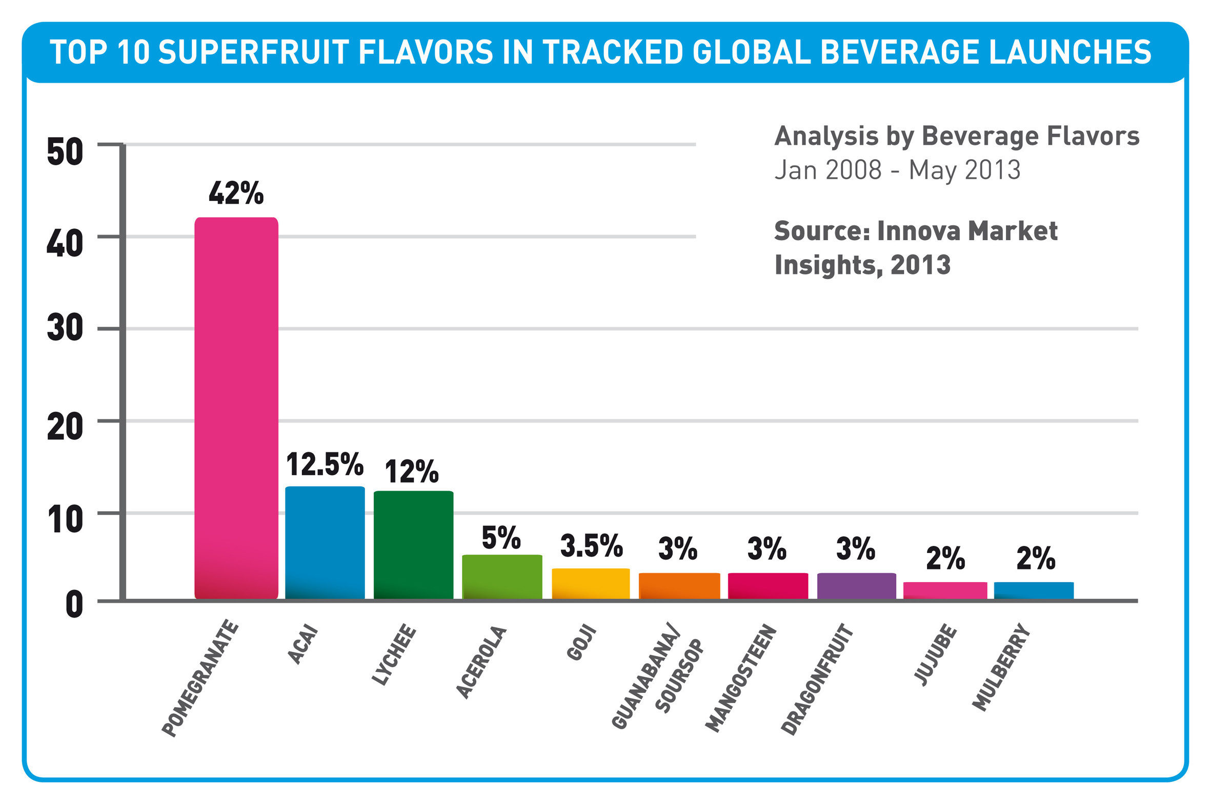 While flavor trends can vary markedly by region, research data from Innova Market Insights indicates that rising interest in superfruits is evident globally, with pomegranate still leading the field. It accounted for over 40% of tracked beverage launches featuring superfruit flavors over the June 2008 to May 2013 period, well ahead of açai and lychee, with 12.5% and 12%, respectively. Emerging or new-generation superfruits are led by guanabana/soursop, cactus/prickly pear and marula.